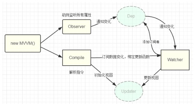 2、观察者-订阅者(数据劫持):vueObserver 数据监听器器,把一个普通的 JavaScript 对象传给Vue 实例的 data 选项,Vue 将遍历此对象所有的属性,并使用Object.defineProperty()方法把这些属性全部转成setter、getter⽅方法。当data中的某个属性被访问时,则会调用getter方法,当data中的属性被改变时,则会调用setter⽅方法。Compile指令解析器器,它的作⽤对每个元素节点的指令进⾏解析,替换模板数据,并绑定对应的更新函数,初始化相应的订阅。Watcher 订阅者,作为连接Observer 和Compile 的桥梁,能够订阅并收到每个属性变动的通知,执⾏指令绑定的相应回调函数。Dep 消息订阅器器,内部维护了一个数组,用来收集订阅者(Watcher),数据变动触发notify函数,再调用订阅者的 update ⽅方法。
